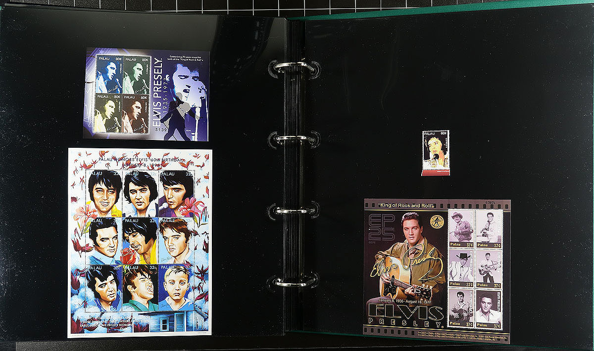 Part 1 - "United States" and "A" to "P" countries, with some "St. Vincent" in large 50 page full-sheet UniSafe four-ring binder with matching green slipcase (retail $140.00). A comprehensive, mint Never Hinged exhibit and collection of singles (a few are gold leaf high value singles), sets (including complete sets where Elvis was only one of the artists being commemorated), souvenir sheets, occasional maxi-card, first day cover, imperforate variety plus some progressive proofs. Cleanly laid out, comprehensive and with enormous initial cost ($200.00 for the proofs alone) with almost everything else easily have costing $5-$20 per set. Countries includes Albania, Antigua & Barbuda, Bhutan, Burkina Faso, Chad, Congo, Dominica, Gambia, Germany, Guinea-Bissau, Ghana, Grenada (& Grenadines), Guyana, Kurdistan, Liberia, Madagascar, Malagasy, Maldives, Marshall Islands, Micronesia, Mongolia, Nevis, Palau and Papua New Guinea. A total of 68 "world" stamps (+ 76 from the American issue, including a complete sheet), 159 souvenir sheets/sheetlets, 12 covers and 16 plate proofs pairs. Estimate =