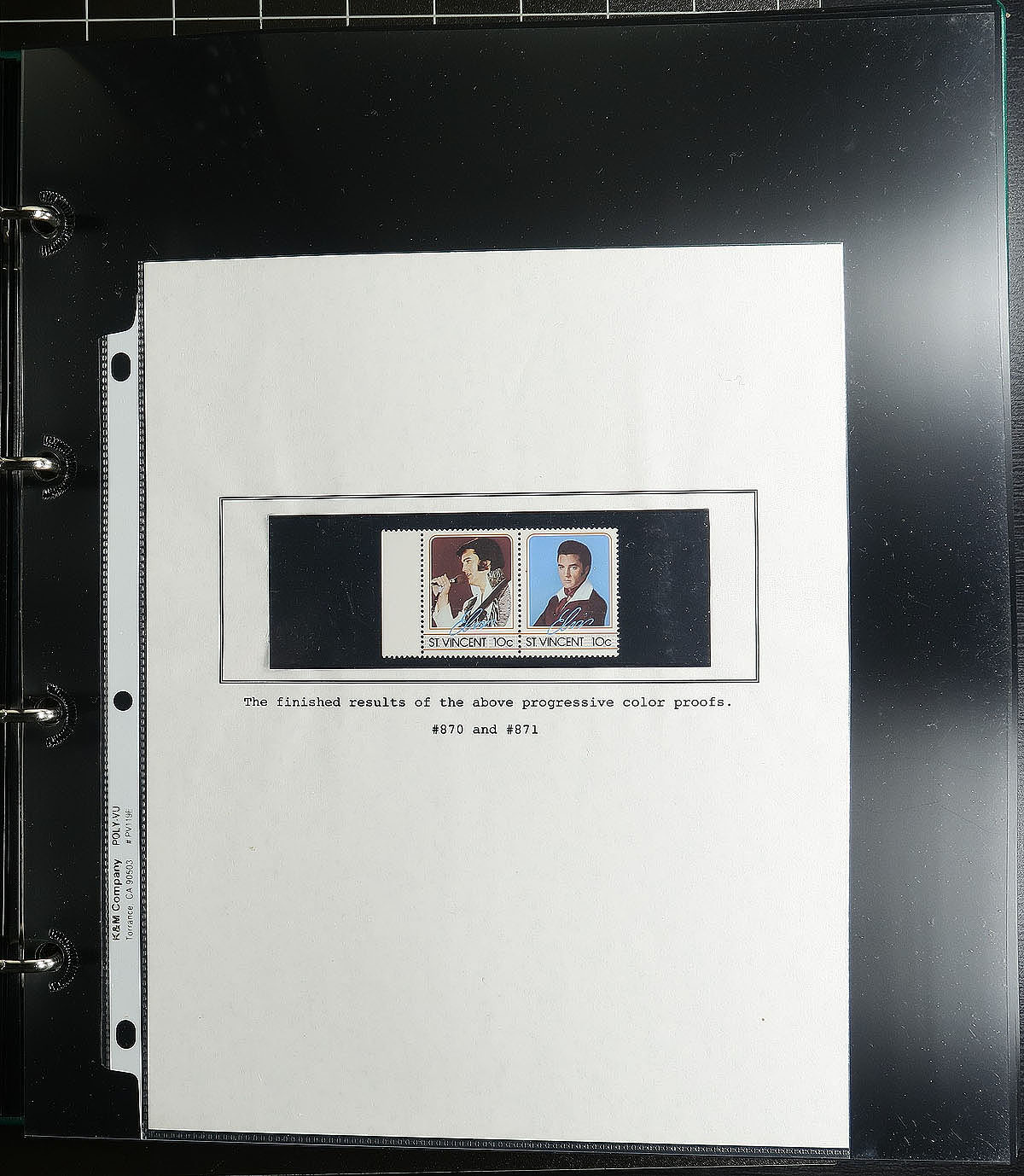 Part 1 - "United States" and "A" to "P" countries, with some "St. Vincent" in large 50 page full-sheet UniSafe four-ring binder with matching green slipcase (retail $140.00). A comprehensive, mint Never Hinged exhibit and collection of singles (a few are gold leaf high value singles), sets (including complete sets where Elvis was only one of the artists being commemorated), souvenir sheets, occasional maxi-card, first day cover, imperforate variety plus some progressive proofs. Cleanly laid out, comprehensive and with enormous initial cost ($200.00 for the proofs alone) with almost everything else easily have costing $5-$20 per set. Countries includes Albania, Antigua & Barbuda, Bhutan, Burkina Faso, Chad, Congo, Dominica, Gambia, Germany, Guinea-Bissau, Ghana, Grenada (& Grenadines), Guyana, Kurdistan, Liberia, Madagascar, Malagasy, Maldives, Marshall Islands, Micronesia, Mongolia, Nevis, Palau and Papua New Guinea. A total of 68 "world" stamps (+ 76 from the American issue, including a complete sheet), 159 souvenir sheets/sheetlets, 12 covers and 16 plate proofs pairs. Estimate =