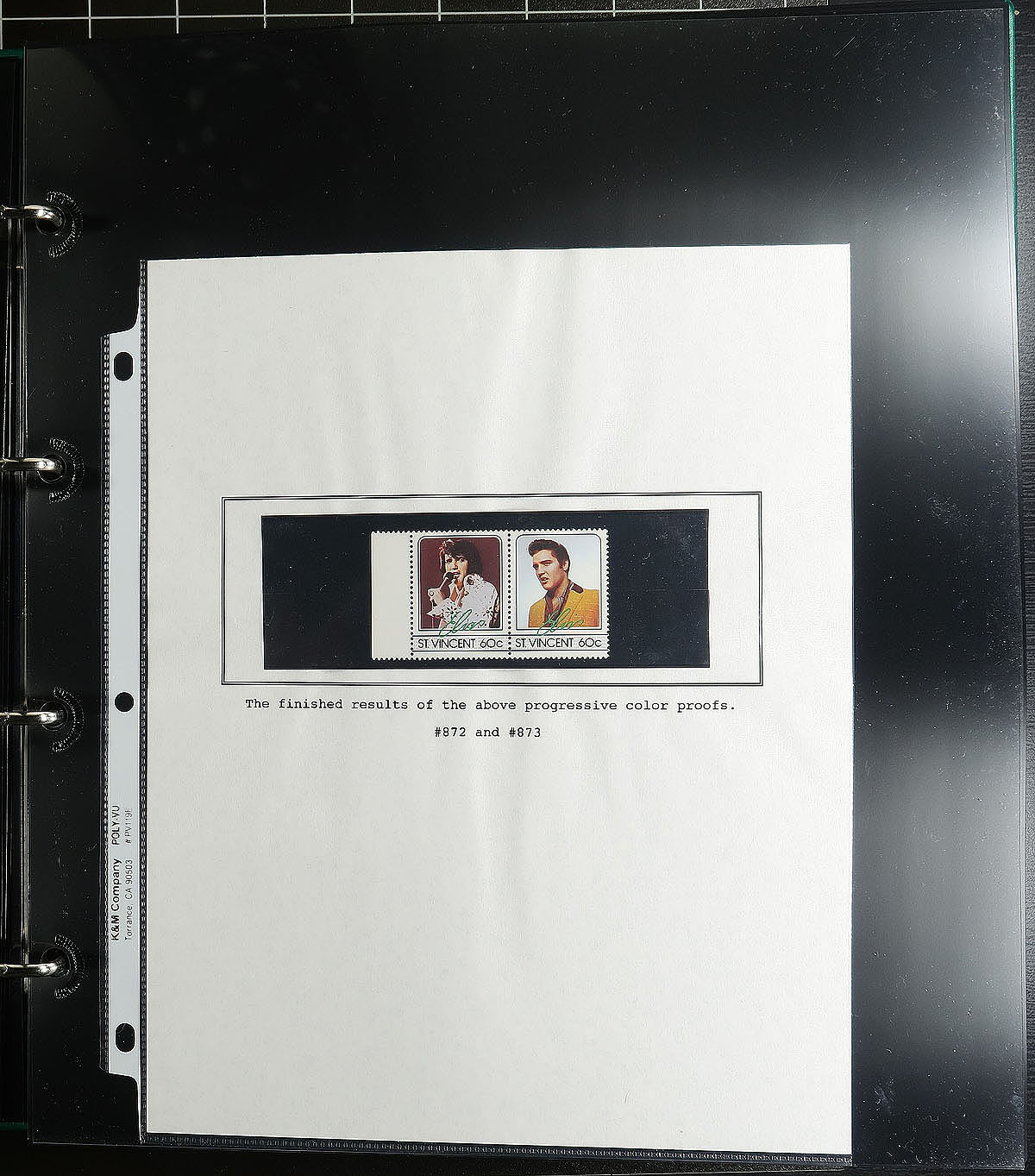 Part 1 - "United States" and "A" to "P" countries, with some "St. Vincent" in large 50 page full-sheet UniSafe four-ring binder with matching green slipcase (retail $140.00). A comprehensive, mint Never Hinged exhibit and collection of singles (a few are gold leaf high value singles), sets (including complete sets where Elvis was only one of the artists being commemorated), souvenir sheets, occasional maxi-card, first day cover, imperforate variety plus some progressive proofs. Cleanly laid out, comprehensive and with enormous initial cost ($200.00 for the proofs alone) with almost everything else easily have costing $5-$20 per set. Countries includes Albania, Antigua & Barbuda, Bhutan, Burkina Faso, Chad, Congo, Dominica, Gambia, Germany, Guinea-Bissau, Ghana, Grenada (& Grenadines), Guyana, Kurdistan, Liberia, Madagascar, Malagasy, Maldives, Marshall Islands, Micronesia, Mongolia, Nevis, Palau and Papua New Guinea. A total of 68 "world" stamps (+ 76 from the American issue, including a complete sheet), 159 souvenir sheets/sheetlets, 12 covers and 16 plate proofs pairs. Estimate =
