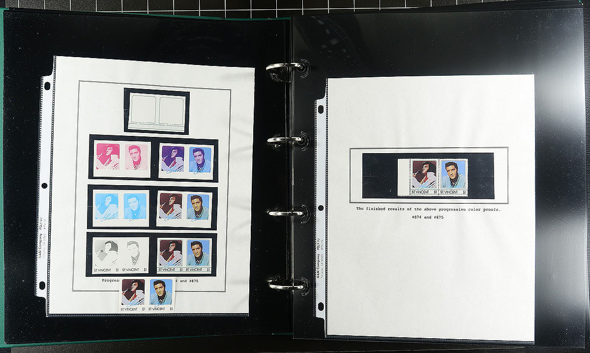 Part 1 - "United States" and "A" to "P" countries, with some "St. Vincent" in large 50 page full-sheet UniSafe four-ring binder with matching green slipcase (retail $140.00). A comprehensive, mint Never Hinged exhibit and collection of singles (a few are gold leaf high value singles), sets (including complete sets where Elvis was only one of the artists being commemorated), souvenir sheets, occasional maxi-card, first day cover, imperforate variety plus some progressive proofs. Cleanly laid out, comprehensive and with enormous initial cost ($200.00 for the proofs alone) with almost everything else easily have costing $5-$20 per set. Countries includes Albania, Antigua & Barbuda, Bhutan, Burkina Faso, Chad, Congo, Dominica, Gambia, Germany, Guinea-Bissau, Ghana, Grenada (& Grenadines), Guyana, Kurdistan, Liberia, Madagascar, Malagasy, Maldives, Marshall Islands, Micronesia, Mongolia, Nevis, Palau and Papua New Guinea. A total of 68 "world" stamps (+ 76 from the American issue, including a complete sheet), 159 souvenir sheets/sheetlets, 12 covers and 16 plate proofs pairs. Estimate =