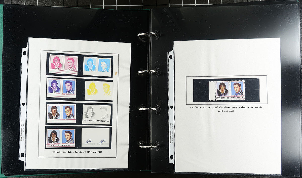 Part 1 - "United States" and "A" to "P" countries, with some "St. Vincent" in large 50 page full-sheet UniSafe four-ring binder with matching green slipcase (retail $140.00). A comprehensive, mint Never Hinged exhibit and collection of singles (a few are gold leaf high value singles), sets (including complete sets where Elvis was only one of the artists being commemorated), souvenir sheets, occasional maxi-card, first day cover, imperforate variety plus some progressive proofs. Cleanly laid out, comprehensive and with enormous initial cost ($200.00 for the proofs alone) with almost everything else easily have costing $5-$20 per set. Countries includes Albania, Antigua & Barbuda, Bhutan, Burkina Faso, Chad, Congo, Dominica, Gambia, Germany, Guinea-Bissau, Ghana, Grenada (& Grenadines), Guyana, Kurdistan, Liberia, Madagascar, Malagasy, Maldives, Marshall Islands, Micronesia, Mongolia, Nevis, Palau and Papua New Guinea. A total of 68 "world" stamps (+ 76 from the American issue, including a complete sheet), 159 souvenir sheets/sheetlets, 12 covers and 16 plate proofs pairs. Estimate =