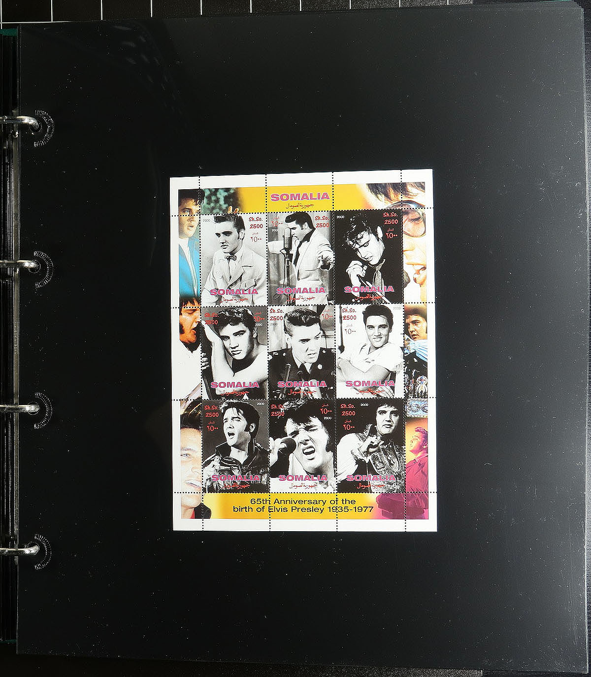 Part 2 -"Q"to "U" countries, with some "St. Vincent" in large 50 page full-sheet UniSafe brand four-ring binder with matching green slipcase (retail $140.00). Comprehensive, mostly mint Never Hinged collection of singles, sets (including complete sets where Elvis was only one of the artists being commemorated), souvenir sheets, and the occasional maxi-card / first day cover. Cleanly laid out, comprehensive and with enormous initial cost. Countries includes Sao Tome & Principe, Senegal, Sierra Leone, St. Vincent (including Grenadines and smaller islands!), Somalia, Sweden, Tajikistan, Tanzania, United States. This part of the collection includes a significant amount of philatelic and non-philatelic ephemera. Total of 15 stamps (+ over 100 American issues with some varieties and a complete "musicians" sheet), 47 souvenir sheets/sheetlets and 30 covers. Estimate =