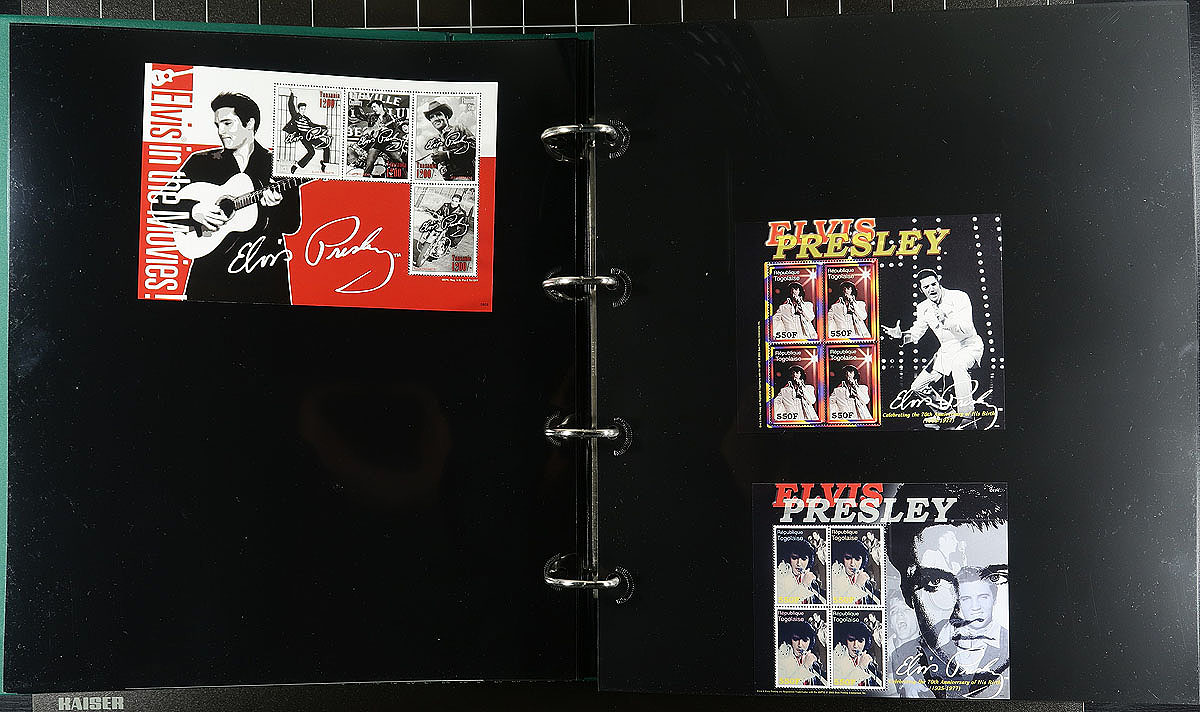 Part 2 -"Q"to "U" countries, with some "St. Vincent" in large 50 page full-sheet UniSafe brand four-ring binder with matching green slipcase (retail $140.00). Comprehensive, mostly mint Never Hinged collection of singles, sets (including complete sets where Elvis was only one of the artists being commemorated), souvenir sheets, and the occasional maxi-card / first day cover. Cleanly laid out, comprehensive and with enormous initial cost. Countries includes Sao Tome & Principe, Senegal, Sierra Leone, St. Vincent (including Grenadines and smaller islands!), Somalia, Sweden, Tajikistan, Tanzania, United States. This part of the collection includes a significant amount of philatelic and non-philatelic ephemera. Total of 15 stamps (+ over 100 American issues with some varieties and a complete "musicians" sheet), 47 souvenir sheets/sheetlets and 30 covers. Estimate =