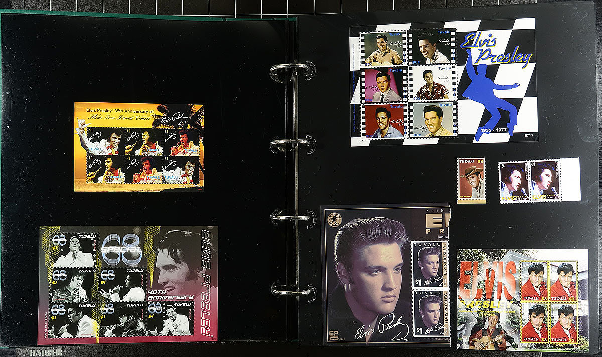 Part 2 -"Q"to "U" countries, with some "St. Vincent" in large 50 page full-sheet UniSafe brand four-ring binder with matching green slipcase (retail $140.00). Comprehensive, mostly mint Never Hinged collection of singles, sets (including complete sets where Elvis was only one of the artists being commemorated), souvenir sheets, and the occasional maxi-card / first day cover. Cleanly laid out, comprehensive and with enormous initial cost. Countries includes Sao Tome & Principe, Senegal, Sierra Leone, St. Vincent (including Grenadines and smaller islands!), Somalia, Sweden, Tajikistan, Tanzania, United States. This part of the collection includes a significant amount of philatelic and non-philatelic ephemera. Total of 15 stamps (+ over 100 American issues with some varieties and a complete "musicians" sheet), 47 souvenir sheets/sheetlets and 30 covers. Estimate =