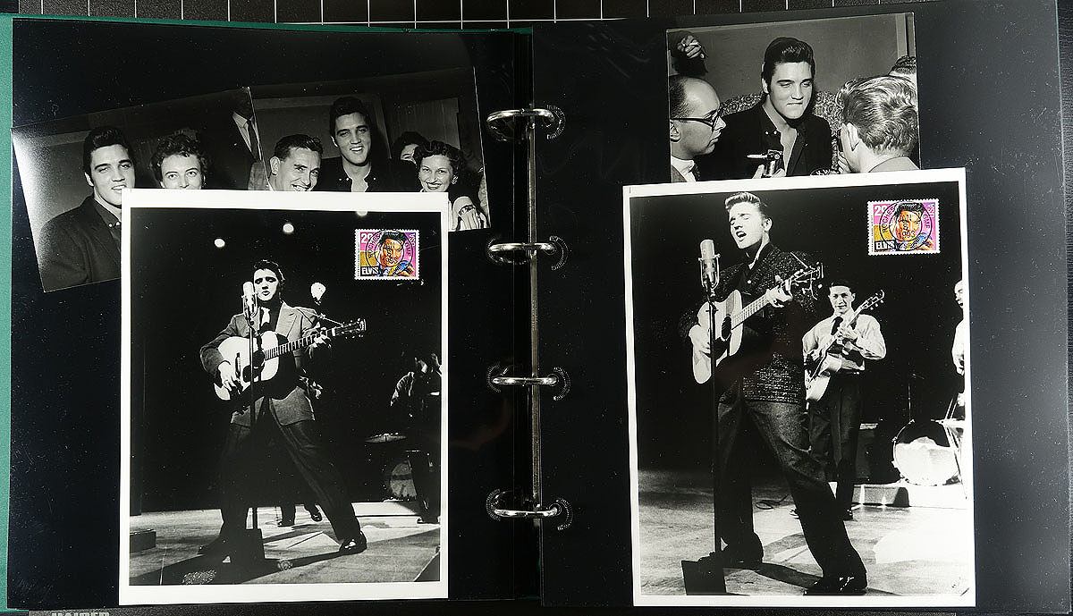 Part 2 -"Q"to "U" countries, with some "St. Vincent" in large 50 page full-sheet UniSafe brand four-ring binder with matching green slipcase (retail $140.00). Comprehensive, mostly mint Never Hinged collection of singles, sets (including complete sets where Elvis was only one of the artists being commemorated), souvenir sheets, and the occasional maxi-card / first day cover. Cleanly laid out, comprehensive and with enormous initial cost. Countries includes Sao Tome & Principe, Senegal, Sierra Leone, St. Vincent (including Grenadines and smaller islands!), Somalia, Sweden, Tajikistan, Tanzania, United States. This part of the collection includes a significant amount of philatelic and non-philatelic ephemera. Total of 15 stamps (+ over 100 American issues with some varieties and a complete "musicians" sheet), 47 souvenir sheets/sheetlets and 30 covers. Estimate =
