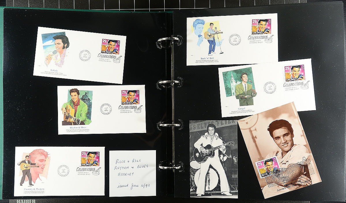 Part 2 -"Q"to "U" countries, with some "St. Vincent" in large 50 page full-sheet UniSafe brand four-ring binder with matching green slipcase (retail $140.00). Comprehensive, mostly mint Never Hinged collection of singles, sets (including complete sets where Elvis was only one of the artists being commemorated), souvenir sheets, and the occasional maxi-card / first day cover. Cleanly laid out, comprehensive and with enormous initial cost. Countries includes Sao Tome & Principe, Senegal, Sierra Leone, St. Vincent (including Grenadines and smaller islands!), Somalia, Sweden, Tajikistan, Tanzania, United States. This part of the collection includes a significant amount of philatelic and non-philatelic ephemera. Total of 15 stamps (+ over 100 American issues with some varieties and a complete "musicians" sheet), 47 souvenir sheets/sheetlets and 30 covers. Estimate =