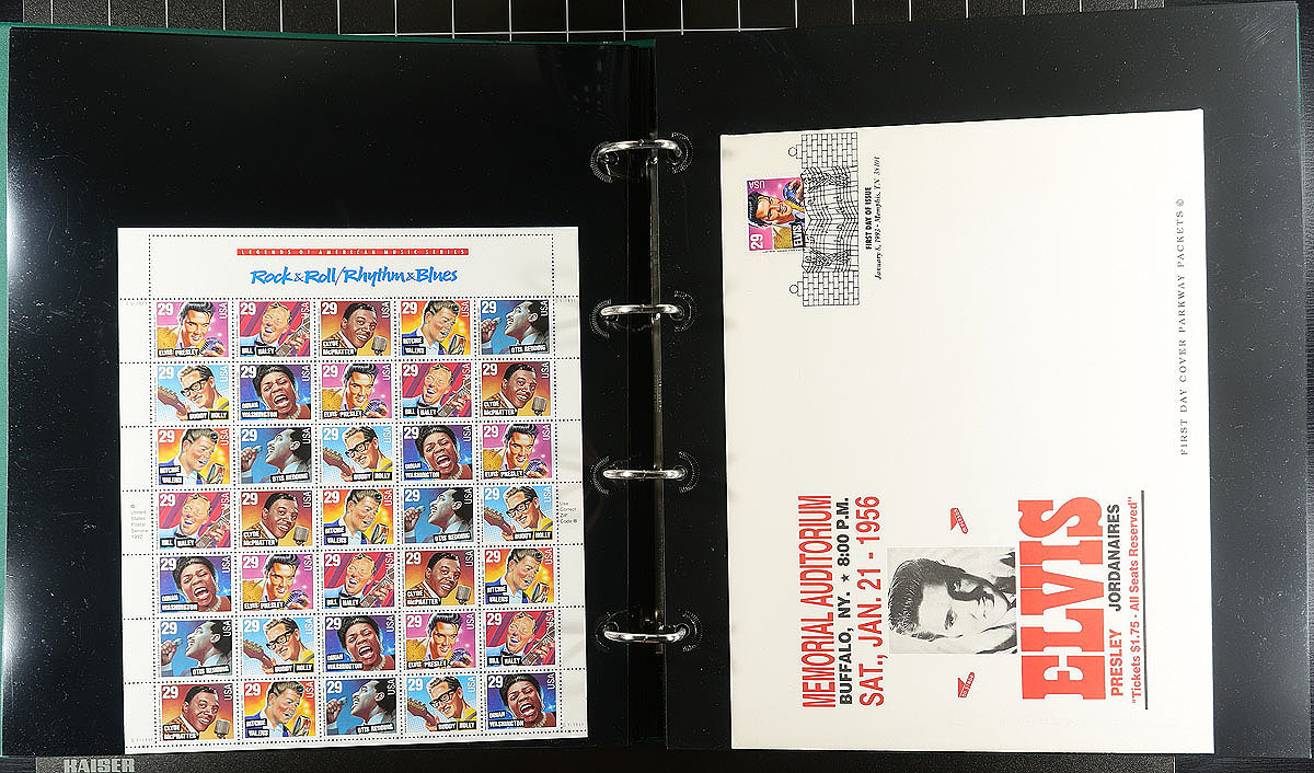 Part 2 -"Q"to "U" countries, with some "St. Vincent" in large 50 page full-sheet UniSafe brand four-ring binder with matching green slipcase (retail $140.00). Comprehensive, mostly mint Never Hinged collection of singles, sets (including complete sets where Elvis was only one of the artists being commemorated), souvenir sheets, and the occasional maxi-card / first day cover. Cleanly laid out, comprehensive and with enormous initial cost. Countries includes Sao Tome & Principe, Senegal, Sierra Leone, St. Vincent (including Grenadines and smaller islands!), Somalia, Sweden, Tajikistan, Tanzania, United States. This part of the collection includes a significant amount of philatelic and non-philatelic ephemera. Total of 15 stamps (+ over 100 American issues with some varieties and a complete "musicians" sheet), 47 souvenir sheets/sheetlets and 30 covers. Estimate =