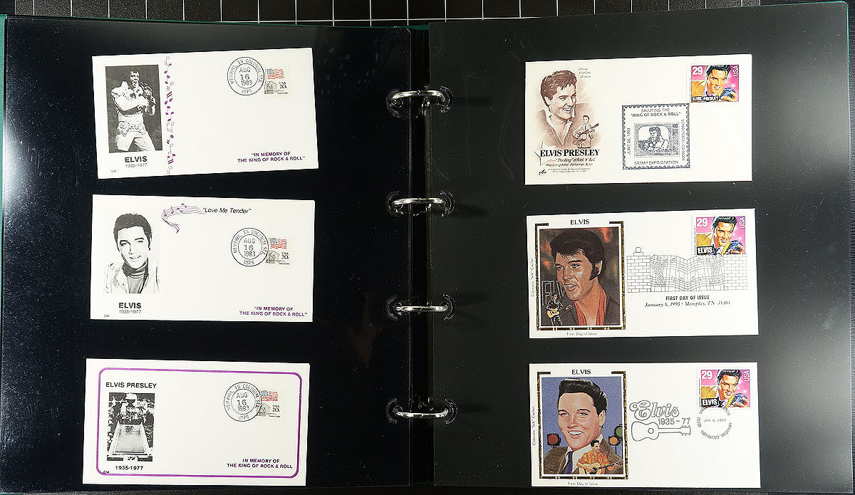 Part 2 -"Q"to "U" countries, with some "St. Vincent" in large 50 page full-sheet UniSafe brand four-ring binder with matching green slipcase (retail $140.00). Comprehensive, mostly mint Never Hinged collection of singles, sets (including complete sets where Elvis was only one of the artists being commemorated), souvenir sheets, and the occasional maxi-card / first day cover. Cleanly laid out, comprehensive and with enormous initial cost. Countries includes Sao Tome & Principe, Senegal, Sierra Leone, St. Vincent (including Grenadines and smaller islands!), Somalia, Sweden, Tajikistan, Tanzania, United States. This part of the collection includes a significant amount of philatelic and non-philatelic ephemera. Total of 15 stamps (+ over 100 American issues with some varieties and a complete "musicians" sheet), 47 souvenir sheets/sheetlets and 30 covers. Estimate =