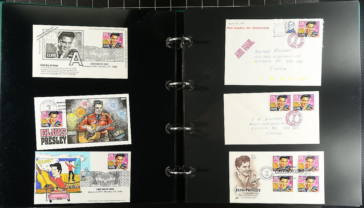 Part 2 -"Q"to "U" countries, with some "St. Vincent" in large 50 page full-sheet UniSafe brand four-ring binder with matching green slipcase (retail $140.00). Comprehensive, mostly mint Never Hinged collection of singles, sets (including complete sets where Elvis was only one of the artists being commemorated), souvenir sheets, and the occasional maxi-card / first day cover. Cleanly laid out, comprehensive and with enormous initial cost. Countries includes Sao Tome & Principe, Senegal, Sierra Leone, St. Vincent (including Grenadines and smaller islands!), Somalia, Sweden, Tajikistan, Tanzania, United States. This part of the collection includes a significant amount of philatelic and non-philatelic ephemera. Total of 15 stamps (+ over 100 American issues with some varieties and a complete "musicians" sheet), 47 souvenir sheets/sheetlets and 30 covers. Estimate =