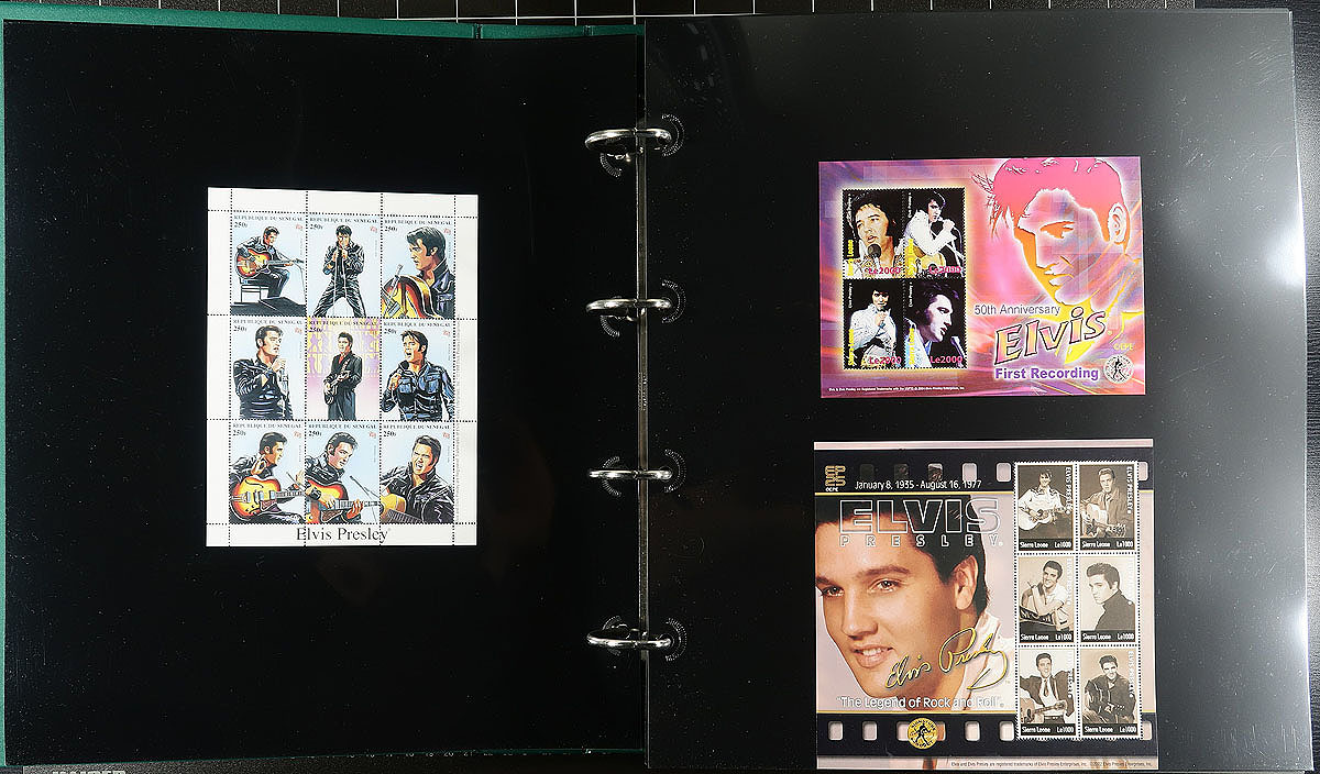 Part 2 -"Q"to "U" countries, with some "St. Vincent" in large 50 page full-sheet UniSafe brand four-ring binder with matching green slipcase (retail $140.00). Comprehensive, mostly mint Never Hinged collection of singles, sets (including complete sets where Elvis was only one of the artists being commemorated), souvenir sheets, and the occasional maxi-card / first day cover. Cleanly laid out, comprehensive and with enormous initial cost. Countries includes Sao Tome & Principe, Senegal, Sierra Leone, St. Vincent (including Grenadines and smaller islands!), Somalia, Sweden, Tajikistan, Tanzania, United States. This part of the collection includes a significant amount of philatelic and non-philatelic ephemera. Total of 15 stamps (+ over 100 American issues with some varieties and a complete "musicians" sheet), 47 souvenir sheets/sheetlets and 30 covers. Estimate =