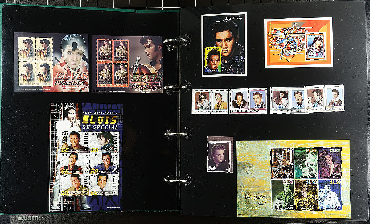 Part 2 -"Q"to "U" countries, with some "St. Vincent" in large 50 page full-sheet UniSafe brand four-ring binder with matching green slipcase (retail $140.00). Comprehensive, mostly mint Never Hinged collection of singles, sets (including complete sets where Elvis was only one of the artists being commemorated), souvenir sheets, and the occasional maxi-card / first day cover. Cleanly laid out, comprehensive and with enormous initial cost. Countries includes Sao Tome & Principe, Senegal, Sierra Leone, St. Vincent (including Grenadines and smaller islands!), Somalia, Sweden, Tajikistan, Tanzania, United States. This part of the collection includes a significant amount of philatelic and non-philatelic ephemera. Total of 15 stamps (+ over 100 American issues with some varieties and a complete "musicians" sheet), 47 souvenir sheets/sheetlets and 30 covers. Estimate =