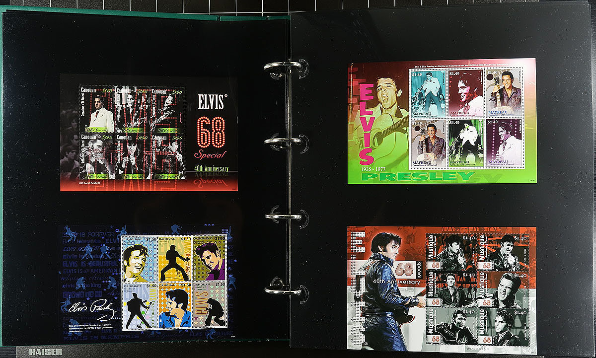 Part 2 -"Q"to "U" countries, with some "St. Vincent" in large 50 page full-sheet UniSafe brand four-ring binder with matching green slipcase (retail $140.00). Comprehensive, mostly mint Never Hinged collection of singles, sets (including complete sets where Elvis was only one of the artists being commemorated), souvenir sheets, and the occasional maxi-card / first day cover. Cleanly laid out, comprehensive and with enormous initial cost. Countries includes Sao Tome & Principe, Senegal, Sierra Leone, St. Vincent (including Grenadines and smaller islands!), Somalia, Sweden, Tajikistan, Tanzania, United States. This part of the collection includes a significant amount of philatelic and non-philatelic ephemera. Total of 15 stamps (+ over 100 American issues with some varieties and a complete "musicians" sheet), 47 souvenir sheets/sheetlets and 30 covers. Estimate =