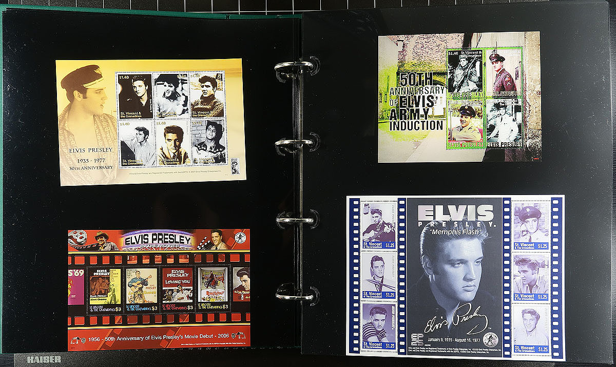 Part 2 -"Q"to "U" countries, with some "St. Vincent" in large 50 page full-sheet UniSafe brand four-ring binder with matching green slipcase (retail $140.00). Comprehensive, mostly mint Never Hinged collection of singles, sets (including complete sets where Elvis was only one of the artists being commemorated), souvenir sheets, and the occasional maxi-card / first day cover. Cleanly laid out, comprehensive and with enormous initial cost. Countries includes Sao Tome & Principe, Senegal, Sierra Leone, St. Vincent (including Grenadines and smaller islands!), Somalia, Sweden, Tajikistan, Tanzania, United States. This part of the collection includes a significant amount of philatelic and non-philatelic ephemera. Total of 15 stamps (+ over 100 American issues with some varieties and a complete "musicians" sheet), 47 souvenir sheets/sheetlets and 30 covers. Estimate =