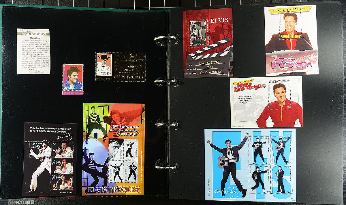 Part 2 -"Q"to "U" countries, with some "St. Vincent" in large 50 page full-sheet UniSafe brand four-ring binder with matching green slipcase (retail $140.00). Comprehensive, mostly mint Never Hinged collection of singles, sets (including complete sets where Elvis was only one of the artists being commemorated), souvenir sheets, and the occasional maxi-card / first day cover. Cleanly laid out, comprehensive and with enormous initial cost. Countries includes Sao Tome & Principe, Senegal, Sierra Leone, St. Vincent (including Grenadines and smaller islands!), Somalia, Sweden, Tajikistan, Tanzania, United States. This part of the collection includes a significant amount of philatelic and non-philatelic ephemera. Total of 15 stamps (+ over 100 American issues with some varieties and a complete "musicians" sheet), 47 souvenir sheets/sheetlets and 30 covers. Estimate =