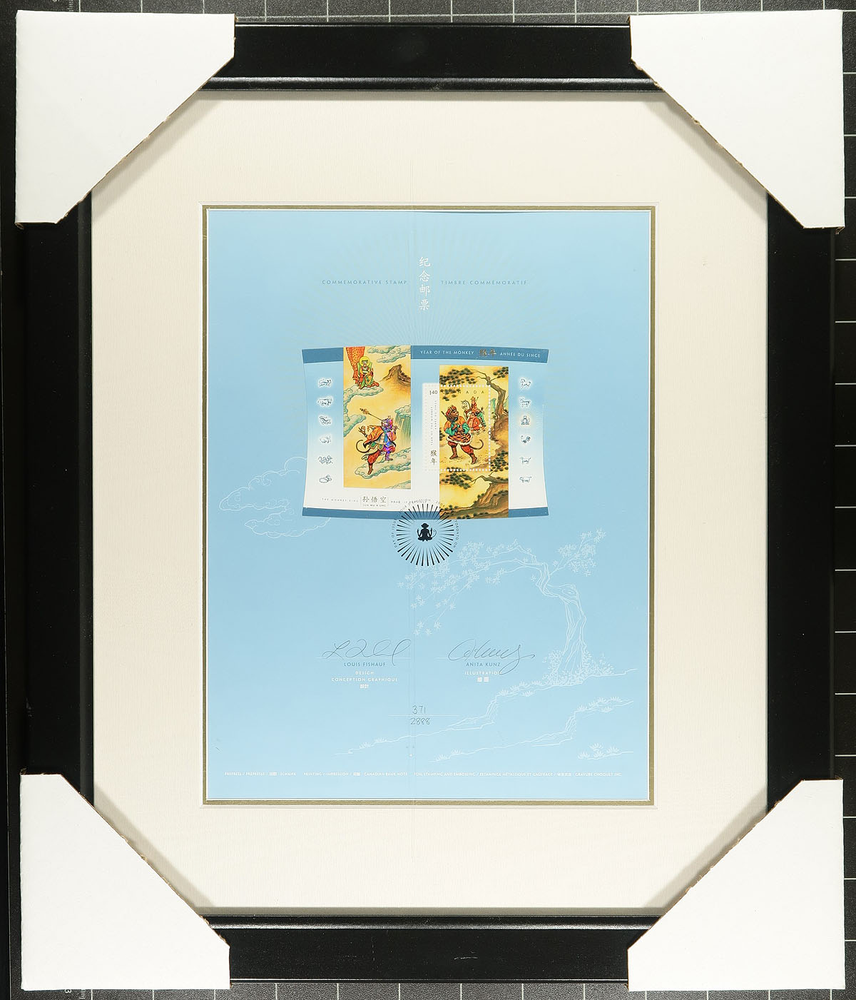 Thematic Articles and Frameable Prints. Valuable quartet of framed Canada Post produced items, consisting of the 2002 Year of the Horse artist signed sheet, the 2003 Year of the Ram artist signed sheet, the 2004 Year of the Monkey artist signed sheet and the 2004 Canadian Open Golf Tournament souvenir. All four items are matted and in high quality glassed frames. These were expensive to buy when they first came out and are actually quite scarce due to low issue numbers. 2024 Unitrade =
