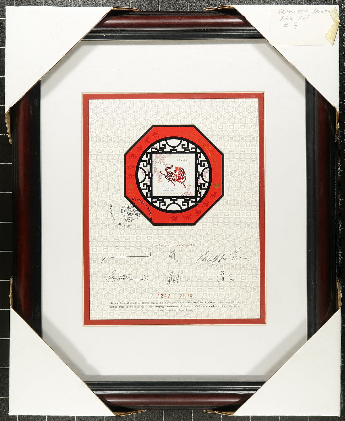 Thematic Articles and Frameable Prints. Valuable quartet of framed Canada Post produced items, consisting of the 2002 Year of the Horse artist signed sheet, the 2003 Year of the Ram artist signed sheet, the 2004 Year of the Monkey artist signed sheet and the 2004 Canadian Open Golf Tournament souvenir. All four items are matted and in high quality glassed frames. These were expensive to buy when they first came out and are actually quite scarce due to low issue numbers. 2024 Unitrade =