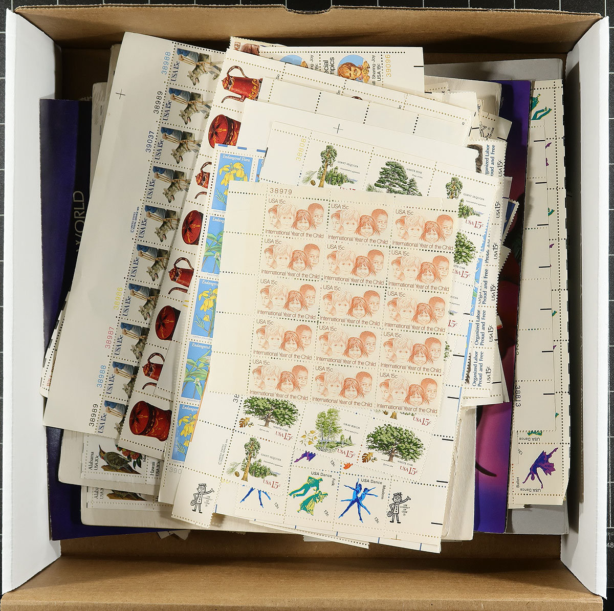 Postage HOARD. A collector's hoard of blocks, plate blocks and sheets, largely from the 1960's / 1980's and primarily in the 4c to 20c range. Accumulated at time of issue, often because of an interest in the topic illustrated. Noted several "Birds of 50 States" sheets. Face value alone is US$969.54 ($1308.90 CDN). Estimate =