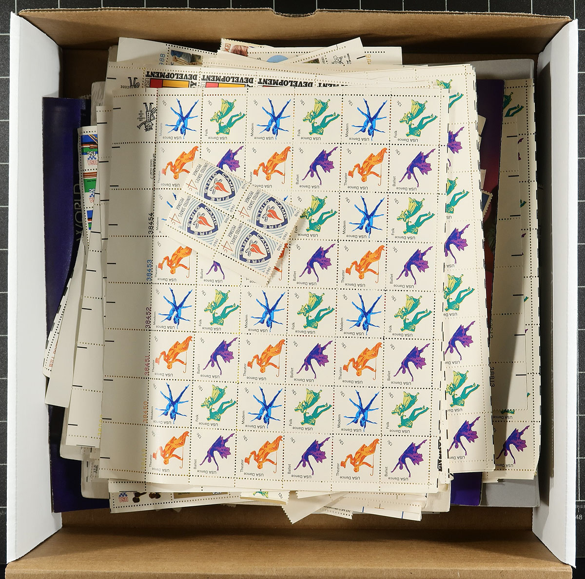 Postage HOARD. A collector's hoard of blocks, plate blocks and sheets, largely from the 1960's / 1980's and primarily in the 4c to 20c range. Accumulated at time of issue, often because of an interest in the topic illustrated. Noted several "Birds of 50 States" sheets. Face value alone is US$969.54 ($1308.90 CDN). Estimate =