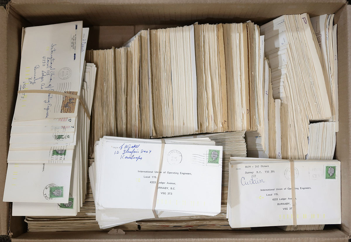 British Columbia Postal History. Collection / accumulation of roughly 1,200 covers with B.C. town postmarks filling a box. The vast majority of covers are organized by A to W town names, generally ranging from the 1970's paying 10c to 17c first class rates. The majority of postmarks appear to be machine types with a few slogan cancels noted. Some towns have duplication up to 5, with most having different frankings. A nice lot for the B.C. postmark collector. Estimate =