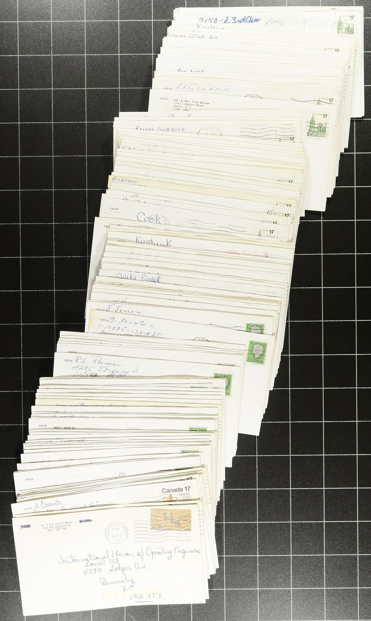 British Columbia Postal History. Collection / accumulation of roughly 1,200 covers with B.C. town postmarks filling a box. The vast majority of covers are organized by A to W town names, generally ranging from the 1970's paying 10c to 17c first class rates. The majority of postmarks appear to be machine types with a few slogan cancels noted. Some towns have duplication up to 5, with most having different frankings. A nice lot for the B.C. postmark collector. Estimate =