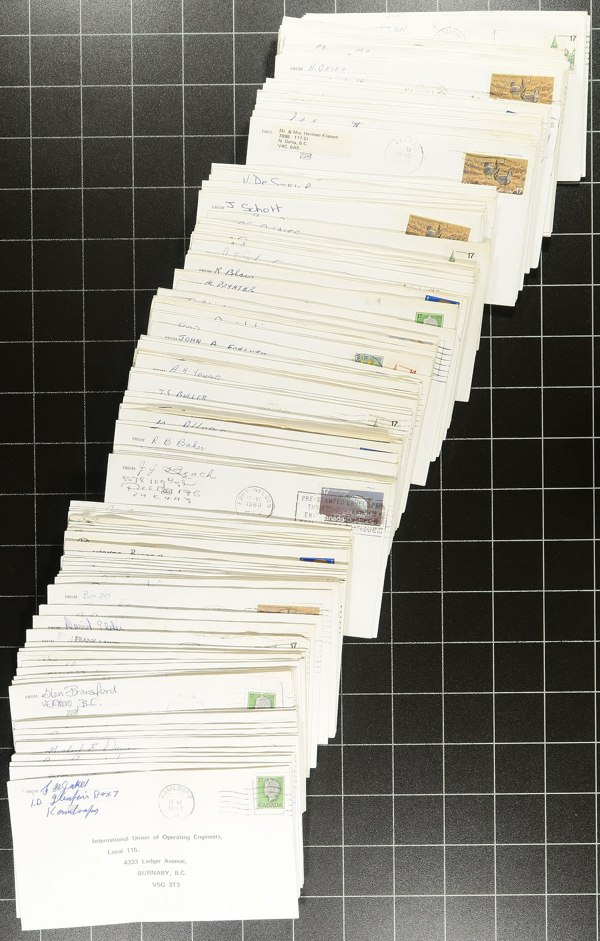 British Columbia Postal History. Collection / accumulation of roughly 1,200 covers with B.C. town postmarks filling a box. The vast majority of covers are organized by A to W town names, generally ranging from the 1970's paying 10c to 17c first class rates. The majority of postmarks appear to be machine types with a few slogan cancels noted. Some towns have duplication up to 5, with most having different frankings. A nice lot for the B.C. postmark collector. Estimate =