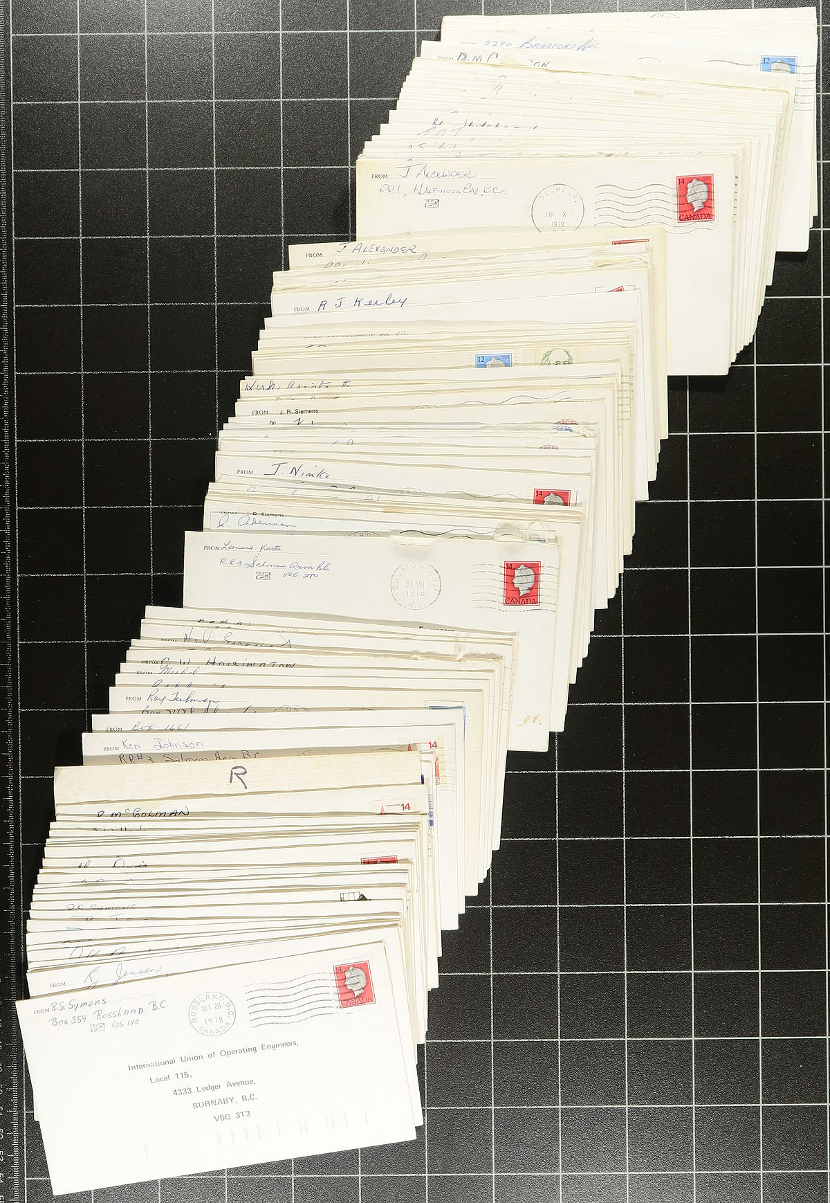 British Columbia Postal History. Collection / accumulation of roughly 1,200 covers with B.C. town postmarks filling a box. The vast majority of covers are organized by A to W town names, generally ranging from the 1970's paying 10c to 17c first class rates. The majority of postmarks appear to be machine types with a few slogan cancels noted. Some towns have duplication up to 5, with most having different frankings. A nice lot for the B.C. postmark collector. Estimate =