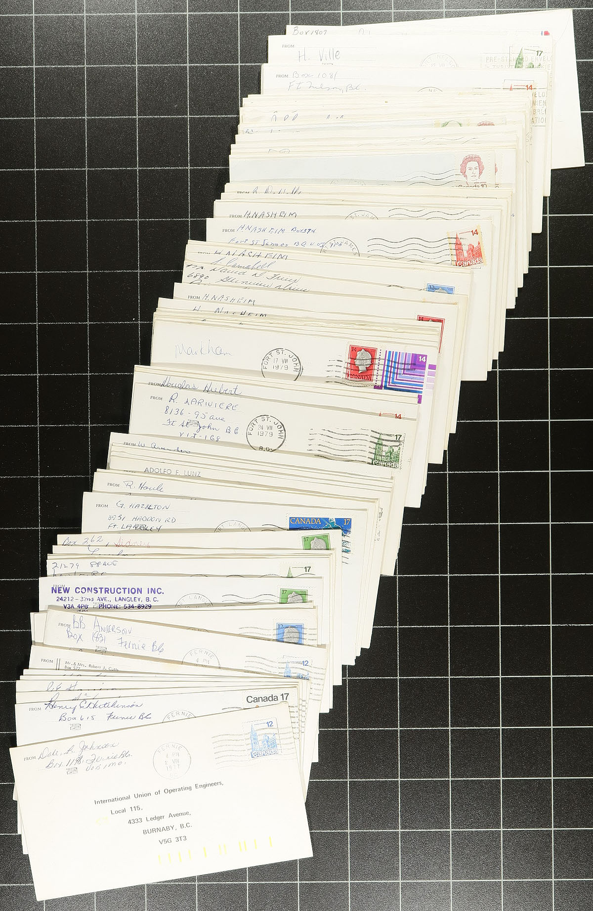 British Columbia Postal History. Collection / accumulation of roughly 1,200 covers with B.C. town postmarks filling a box. The vast majority of covers are organized by A to W town names, generally ranging from the 1970's paying 10c to 17c first class rates. The majority of postmarks appear to be machine types with a few slogan cancels noted. Some towns have duplication up to 5, with most having different frankings. A nice lot for the B.C. postmark collector. Estimate =