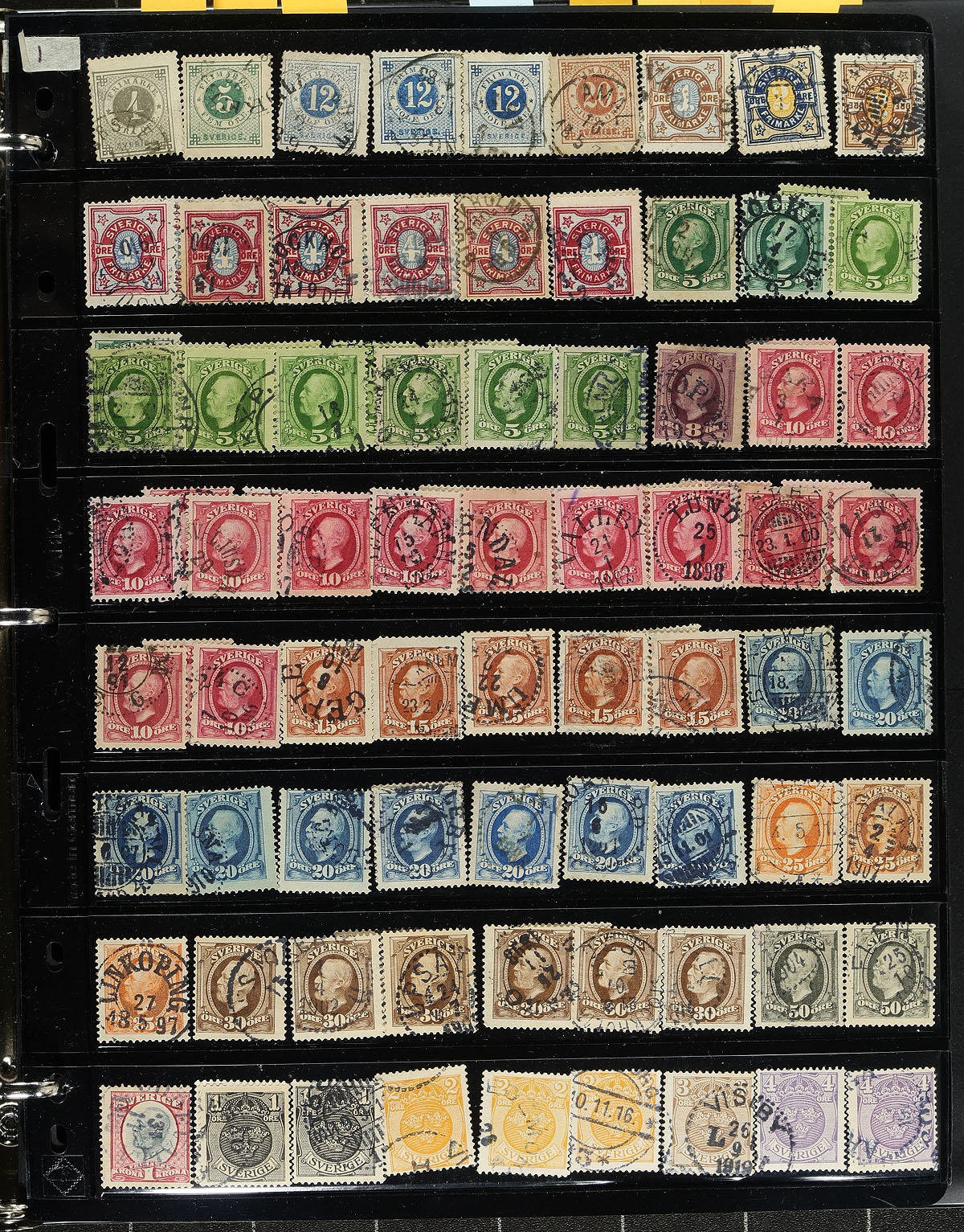 Nice accumulation of used Sweden, 1858-2017, containing a few thousand stamps in roughly 40 double-sided Vario-style stock pages housed in a binder. The lot generally ranges from Scott #6/2797, with a few stamps beyond the given range, including coil and a few back of the book issues. A very nice lot for the postmark hunter as we noted various cds types with many "socked on the nose" town cancels. A spot check indicated a few stamps cataloguing in the $5 to $10 range, leaving better finds to the dedicated collector. Duplication up to 5-10 for some issues, with online photos showing a sampling. Overall fine to very fine. Estimate =
