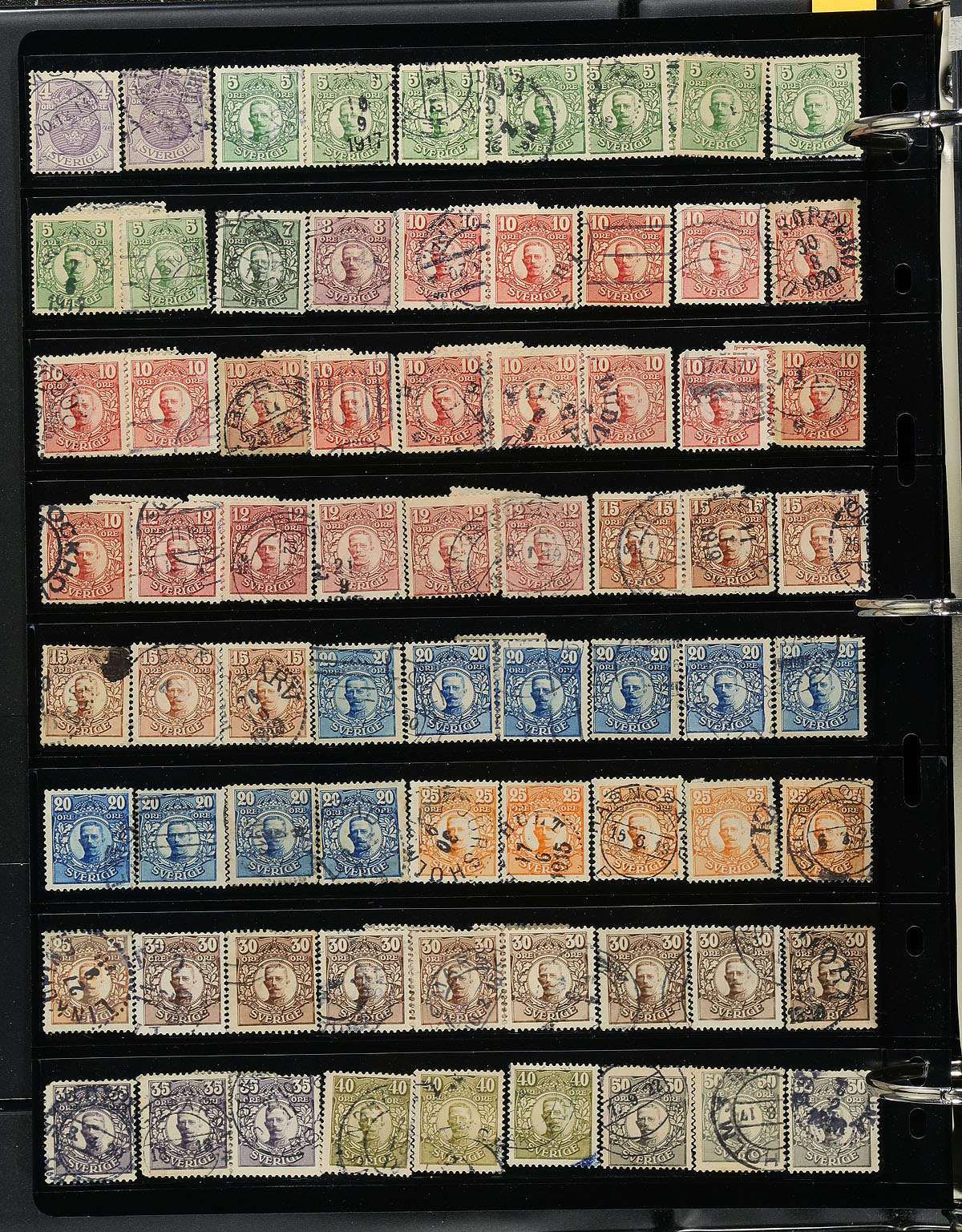 Nice accumulation of used Sweden, 1858-2017, containing a few thousand stamps in roughly 40 double-sided Vario-style stock pages housed in a binder. The lot generally ranges from Scott #6/2797, with a few stamps beyond the given range, including coil and a few back of the book issues. A very nice lot for the postmark hunter as we noted various cds types with many "socked on the nose" town cancels. A spot check indicated a few stamps cataloguing in the $5 to $10 range, leaving better finds to the dedicated collector. Duplication up to 5-10 for some issues, with online photos showing a sampling. Overall fine to very fine. Estimate =