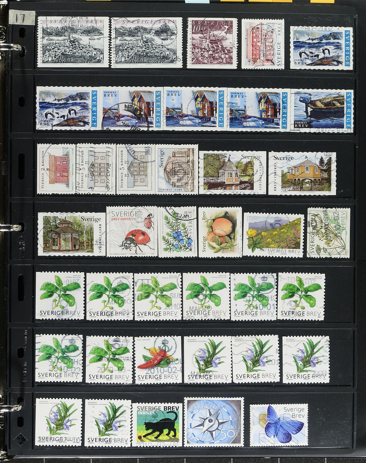 Nice accumulation of used Sweden, 1858-2017, containing a few thousand stamps in roughly 40 double-sided Vario-style stock pages housed in a binder. The lot generally ranges from Scott #6/2797, with a few stamps beyond the given range, including coil and a few back of the book issues. A very nice lot for the postmark hunter as we noted various cds types with many "socked on the nose" town cancels. A spot check indicated a few stamps cataloguing in the $5 to $10 range, leaving better finds to the dedicated collector. Duplication up to 5-10 for some issues, with online photos showing a sampling. Overall fine to very fine. Estimate =