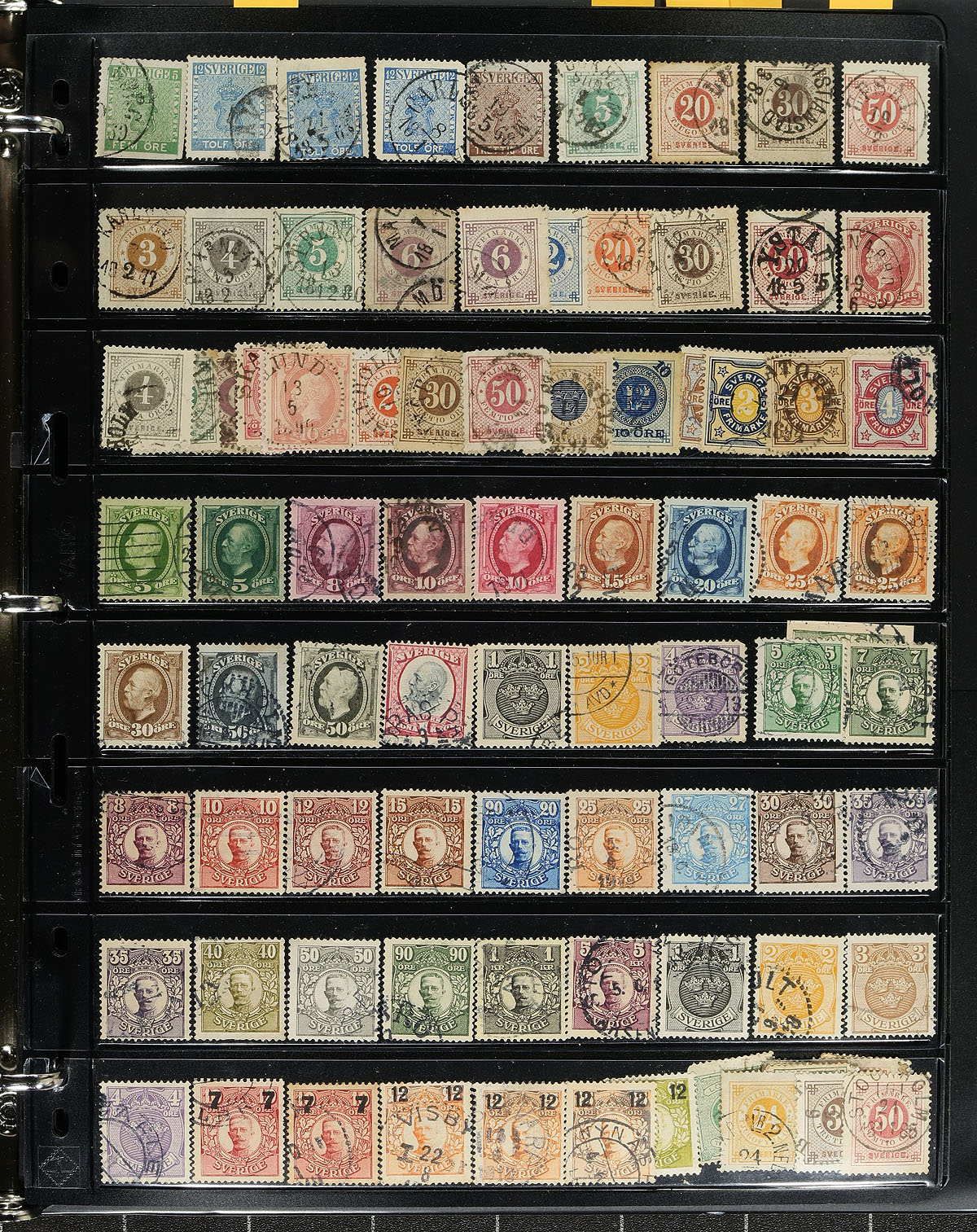 Nice accumulation of used Sweden, 1858-2017, containing a few thousand stamps in roughly 40 double-sided Vario-style stock pages housed in a binder. The lot generally ranges from Scott #6/2797, with a few stamps beyond the given range, including coil and a few back of the book issues. A very nice lot for the postmark hunter as we noted various cds types with many "socked on the nose" town cancels. A spot check indicated a few stamps cataloguing in the $5 to $10 range, leaving better finds to the dedicated collector. Duplication up to 5-10 for some issues, with online photos showing a sampling. Overall fine to very fine. Estimate =