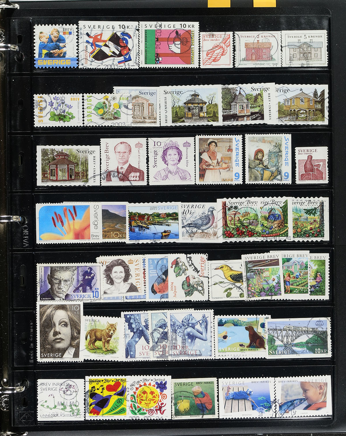 Nice accumulation of used Sweden, 1858-2017, containing a few thousand stamps in roughly 40 double-sided Vario-style stock pages housed in a binder. The lot generally ranges from Scott #6/2797, with a few stamps beyond the given range, including coil and a few back of the book issues. A very nice lot for the postmark hunter as we noted various cds types with many "socked on the nose" town cancels. A spot check indicated a few stamps cataloguing in the $5 to $10 range, leaving better finds to the dedicated collector. Duplication up to 5-10 for some issues, with online photos showing a sampling. Overall fine to very fine. Estimate =