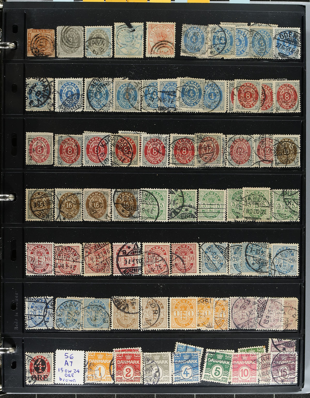 Nice accumulation of used Denmark, 1860's-2011, containing a few thousand stamps in roughly 50 double-sided Vario-style stock pages housed in a binder. The lot generally ranges from Scott #11/1557, with a few stamps beyond the given range, including a few back of the book issues. A very nice lot for the postmark hunter as we noted various cds cancels, with many "socked on the nose" town cancels. A spot check indicated a few stamps cataloguing in the $5 to $10 range, leaving better finds to the dedicated collector. Duplication up to 5-10 for some issues, with online photos showing a sampling. Overall fine to very fine. Estimate =
