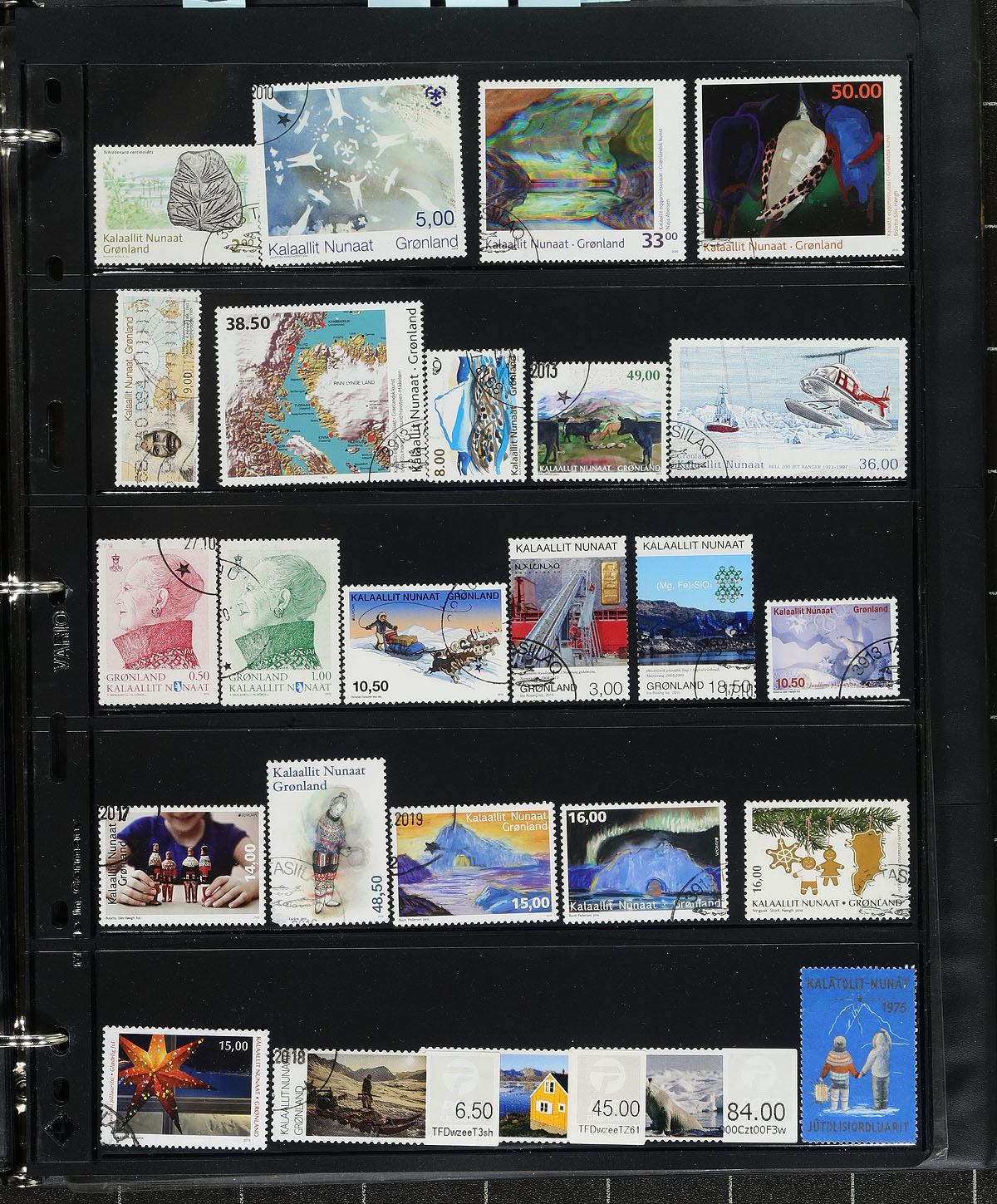 Lovely collection / accumulation of mint and used Greenland, 1938-2019, containing many hundreds of stamps in a stockbook and in several Vario pages in a binder. The lot generally ranges from Scott #1/827, with some issues having a mint and a used example, along with back of the book and some souvenir sheets. A spot check indicated a few singles, along with mint sets cataloguing in the $10 to $20 range, leaving better finds to the dedicated collector. Postmark interest includes bridge types, along with a few pictorial cancels. A nice lot from this very popular collecting country. Estimate =