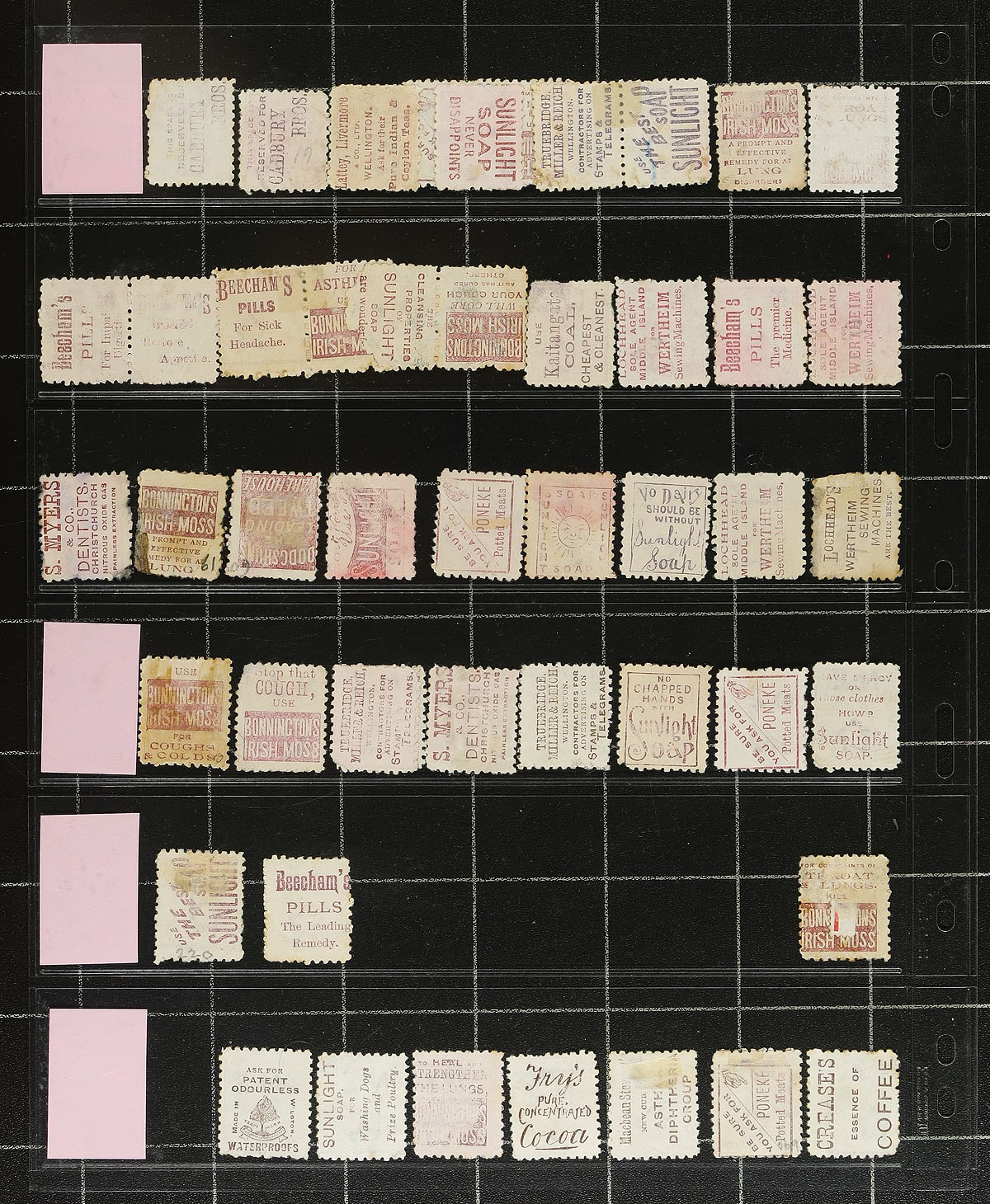Interesting group of 71 used New Zealand with underprint advertising, in two clear stock pages, with Scott #s 61 (x28), 62 (x9), 63 (x2), 64 (x16), 67 (x3), 68 (x13), with a good variety of different companies and types. A nice little lot for the advertising, topical and thematic, and New Zealand collector. Estimate =