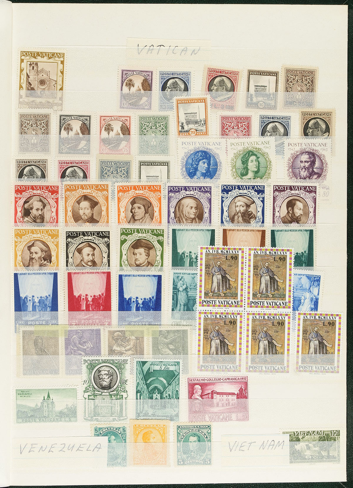 Collection of mint worldwide stamps in 3 Briefmarken stockbooks, containing over 1,000 stamps, noting singles, sets, and blocks, from countries ranging from A to V (roughly 70 different issuing countries). Most of the material appears to range from the 1940s to the 1970's, with better representation from British Commonwealth, French Colonies, European countries and more. A spot check indicated a mixture of never hinged and lightly hinged stamps, with majority of the material appearing to catalogue in the $3 and under range. Still a nice lot for the mint worldwide or topical thematic collector. Estimate =