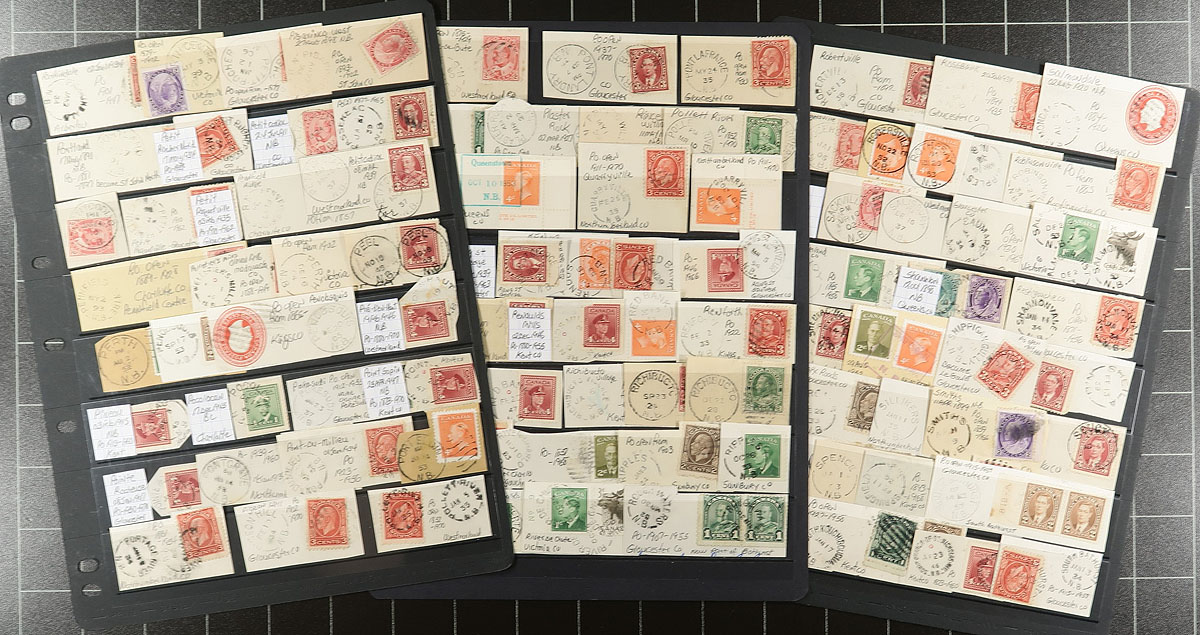 New Brunswick Postmark Collection Part 1. A wonderfully well annotated and assembled collection of approx 670 cancels on stamp / piece, plus 18 blocks. Ranging from Queen Victoria to George VI era and neatly arranged on 29 Hagner stocksheets, often with notes from the original collector and opening/closing dates noted in pencil. Many closed Post Offices here, and the quality of strikes is well above average. A great opportunity for the postmark hound. Estimate =