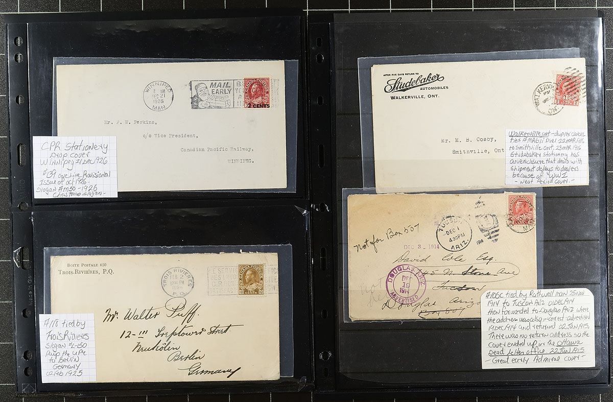 Admiral Postal History. An eclectic assembly of 24 George V Admiral franking covers, from PEI, NS, QC, ONT, MB, SASK and Yukon. Stamps represented are #104, 104c, 105d, 106c (2), 106ii, 106aiis, 106b, 107e, 107i, 108, 111, 112ii, 115, 117ii, 118, 123, 127, 139, MR2, MR3a, MR6ii, MR7 and EN47 (stationery). Very useful for the "on cover" collector, as all but 2 are single use covers. Of particular note are 8 illustrated covers (6 in colour), Ottawa Dead Letter Office, Studebaker CC cover (and enclosure), precancels with arrival and CPR / CNR items. A very clean offering. Estimate =