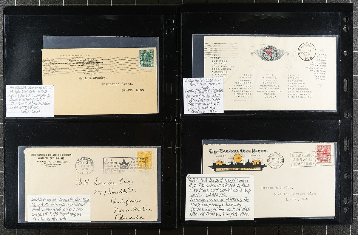 Admiral Postal History. An eclectic assembly of 24 George V Admiral franking covers, from PEI, NS, QC, ONT, MB, SASK and Yukon. Stamps represented are #104, 104c, 105d, 106c (2), 106ii, 106aiis, 106b, 107e, 107i, 108, 111, 112ii, 115, 117ii, 118, 123, 127, 139, MR2, MR3a, MR6ii, MR7 and EN47 (stationery). Very useful for the "on cover" collector, as all but 2 are single use covers. Of particular note are 8 illustrated covers (6 in colour), Ottawa Dead Letter Office, Studebaker CC cover (and enclosure), precancels with arrival and CPR / CNR items. A very clean offering. Estimate =