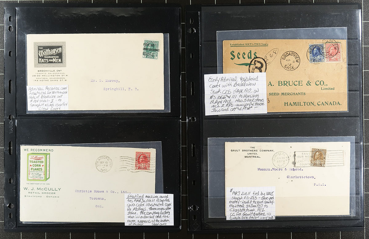 Admiral Postal History. An eclectic assembly of 24 George V Admiral franking covers, from PEI, NS, QC, ONT, MB, SASK and Yukon. Stamps represented are #104, 104c, 105d, 106c (2), 106ii, 106aiis, 106b, 107e, 107i, 108, 111, 112ii, 115, 117ii, 118, 123, 127, 139, MR2, MR3a, MR6ii, MR7 and EN47 (stationery). Very useful for the "on cover" collector, as all but 2 are single use covers. Of particular note are 8 illustrated covers (6 in colour), Ottawa Dead Letter Office, Studebaker CC cover (and enclosure), precancels with arrival and CPR / CNR items. A very clean offering. Estimate =