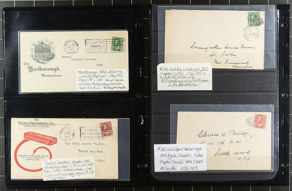 Admiral Postal History. An eclectic assembly of 24 George V Admiral franking covers, from PEI, NS, QC, ONT, MB, SASK and Yukon. Stamps represented are #104, 104c, 105d, 106c (2), 106ii, 106aiis, 106b, 107e, 107i, 108, 111, 112ii, 115, 117ii, 118, 123, 127, 139, MR2, MR3a, MR6ii, MR7 and EN47 (stationery). Very useful for the "on cover" collector, as all but 2 are single use covers. Of particular note are 8 illustrated covers (6 in colour), Ottawa Dead Letter Office, Studebaker CC cover (and enclosure), precancels with arrival and CPR / CNR items. A very clean offering. Estimate =