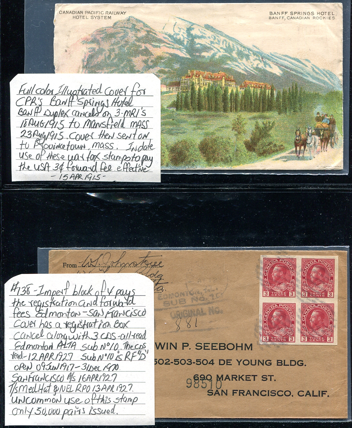Admiral Era Alberta Postal History. A compact and enticing offering of "Alberta Admirals" including 5 covers (with 2x rates to Denmark, Banff illustrated and #138 imperf block), both the surcharge blocks (#139/140) and "socked on the nose" postmarks which include Roycroft, Calgary CPR Depot (x2, both perfins), Prospy, Ranching and St Paul De Metis. Very clean material, meticulously arranged on two double-sided stocksheets. Estimate =
