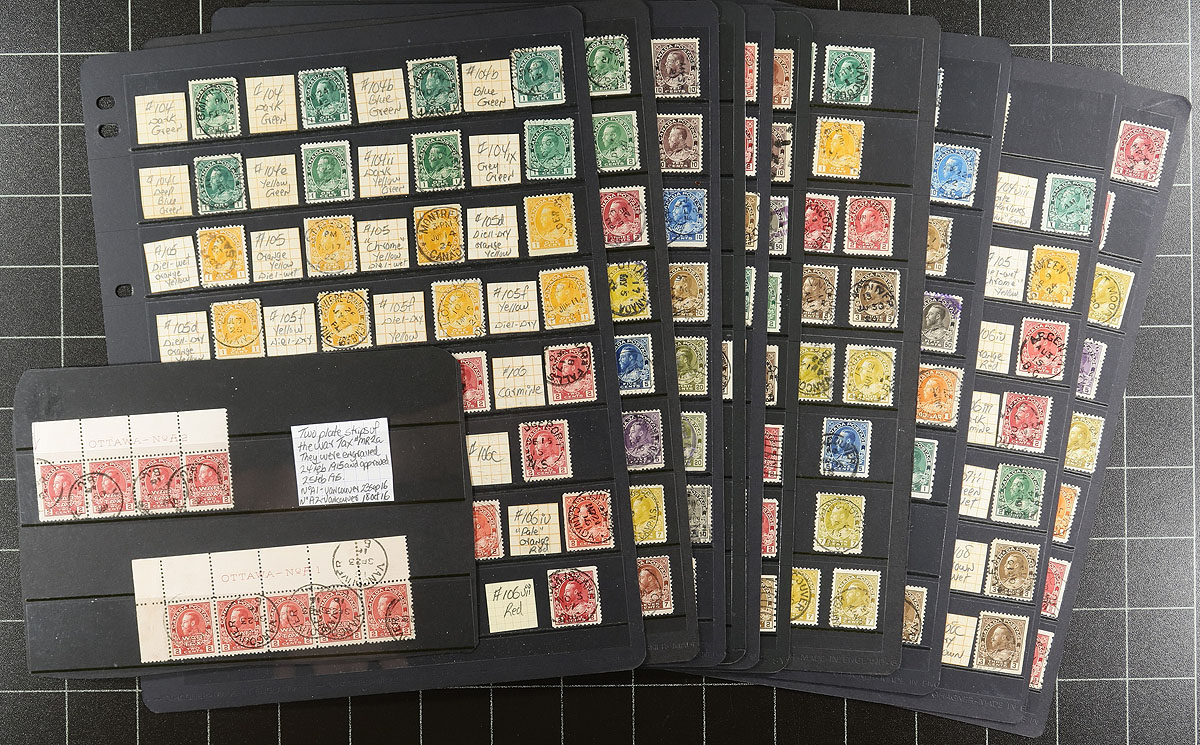 A duo of Admiral Postmark assemblies, combined to make an outstanding offering. Part A consists of Vancouver / BC postmarks on 179 stamps, including plate number strips, high-values, coils, War Tax and identified Unitrade listed sub-types. Part B consists of "socked on the nose" postmarks from AB, SASK, MB, ONT, QC and NS and SHADE VARIETIES on 183 stamps, including high-values, coils (note a Hamiton late Squared Circle), part-perf coils, imperforate pair, lathework etc. The owner notes that the 2024 Unitrade for Part B alone adds up to $791.00! All neatly arranged and largely identified on 10 stockpages and a stockcard. A great opportunity for any collector that appreciated nicely used stamps. Estimate =