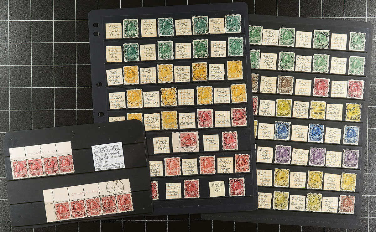 A duo of Admiral Postmark assemblies, combined to make an outstanding offering. Part A consists of Vancouver / BC postmarks on 179 stamps, including plate number strips, high-values, coils, War Tax and identified Unitrade listed sub-types. Part B consists of "socked on the nose" postmarks from AB, SASK, MB, ONT, QC and NS and SHADE VARIETIES on 183 stamps, including high-values, coils (note a Hamiton late Squared Circle), part-perf coils, imperforate pair, lathework etc. The owner notes that the 2024 Unitrade for Part B alone adds up to $791.00! All neatly arranged and largely identified on 10 stockpages and a stockcard. A great opportunity for any collector that appreciated nicely used stamps. Estimate =