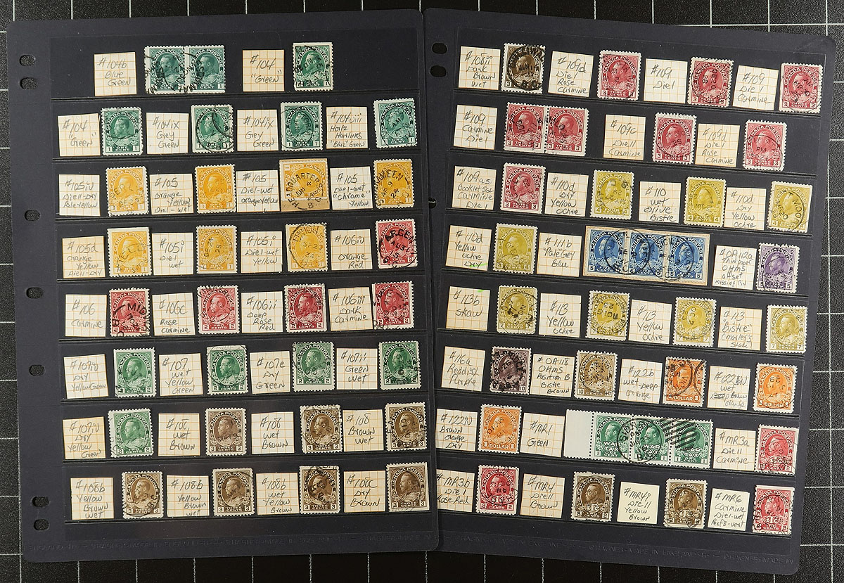 A duo of Admiral Postmark assemblies, combined to make an outstanding offering. Part A consists of Vancouver / BC postmarks on 179 stamps, including plate number strips, high-values, coils, War Tax and identified Unitrade listed sub-types. Part B consists of "socked on the nose" postmarks from AB, SASK, MB, ONT, QC and NS and SHADE VARIETIES on 183 stamps, including high-values, coils (note a Hamiton late Squared Circle), part-perf coils, imperforate pair, lathework etc. The owner notes that the 2024 Unitrade for Part B alone adds up to $791.00! All neatly arranged and largely identified on 10 stockpages and a stockcard. A great opportunity for any collector that appreciated nicely used stamps. Estimate =