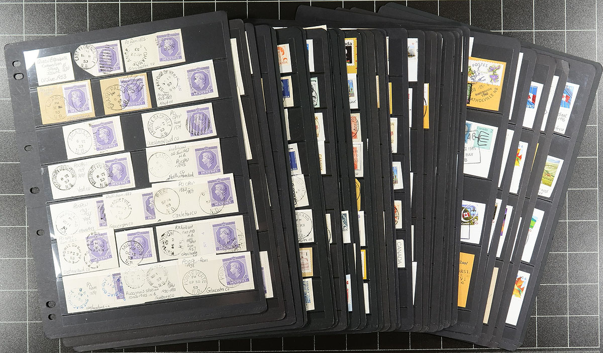 New Brunswick Postmark Collection Part 2. A meticulous "A to Z" Elizabethan collection of NB postmarks on stamp or stamp/piece, neatly arranged and identified on 33 Hagner stockpages (the pages alone are worth a fair bit!). Over 700 postmarks here, including closed Post Offices and with strikes which on average, are well above average. Estimate =