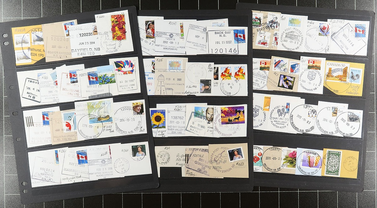 New Brunswick Postmark Collection Part 2. A meticulous "A to Z" Elizabethan collection of NB postmarks on stamp or stamp/piece, neatly arranged and identified on 33 Hagner stockpages (the pages alone are worth a fair bit!). Over 700 postmarks here, including closed Post Offices and with strikes which on average, are well above average. Estimate =
