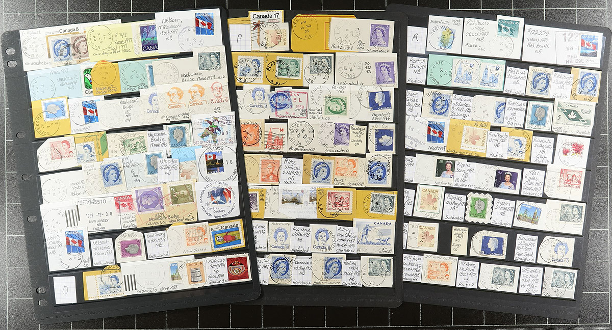 New Brunswick Postmark Collection Part 2. A meticulous "A to Z" Elizabethan collection of NB postmarks on stamp or stamp/piece, neatly arranged and identified on 33 Hagner stockpages (the pages alone are worth a fair bit!). Over 700 postmarks here, including closed Post Offices and with strikes which on average, are well above average. Estimate =