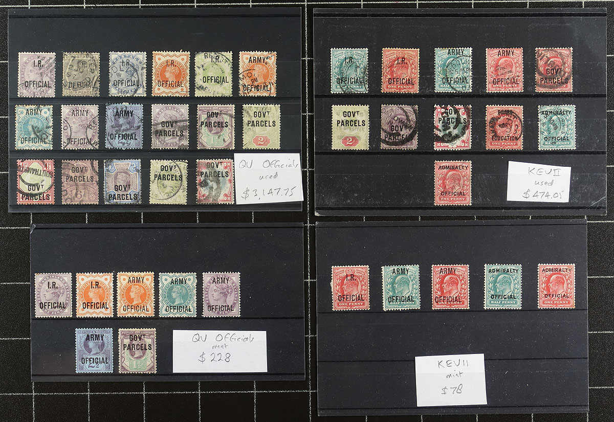 High-value assembly of "back of the book" QV/Edward overprint issues, including "Admiralty Official", "I.R. Official", "Army Official" and Gov't Parcels". A mix of (mostly) used and mint (hinged) arranged on stockcards by the previous owner. Catalogued by the previous owner, but view under cautious lenses, as some of these issues are prone to forgeries. Owner's older Scott US$3927.80 =