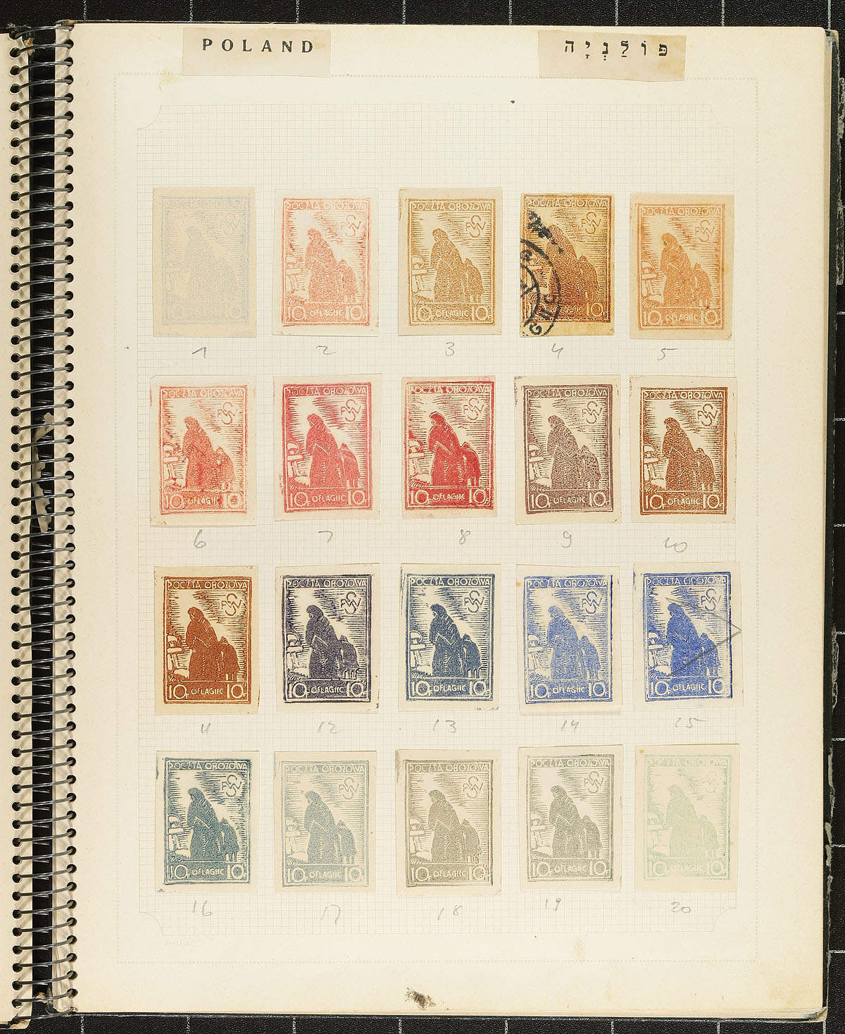 Visually powerful group of Polish POW Camp Woldenberf 1942-1944 camp issued provisional local stamps. The camp was located 1km from Woldenberg housed (at its peak) 5944 officers and 796 orderlies in 25 brick huts, over the 62 acre camp. These philatelically inspired issues have had their use speculated on over the years, as to whether they had actual use (beyond philatelic creation). This lot includes over 100 items including stamps, proof material, postmarks and covers. Listed in Michel catalogue. All neatly hinged in an old-time stamp book (which had travelled for many years with the original Jewish collector who acquired these). The largest assembly of this material we have offered! Estimate =
